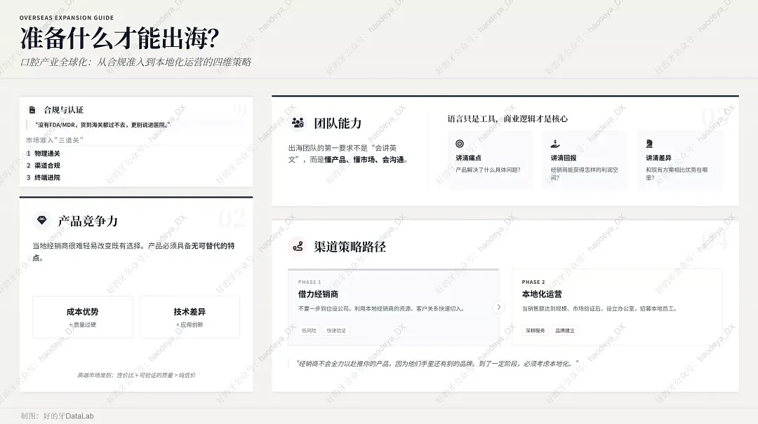 不會。牙醫的工作環境很復雜——在牙醫為中心、4到6平方米范圍內,需要的是一整套工具和材料的系統配合。出海也一樣,你不能指望靠一個產品、一次展會、一個大客戶就"成功"。你需要的是一套系統性的策略:產品+法規+團隊+渠道+本地化。